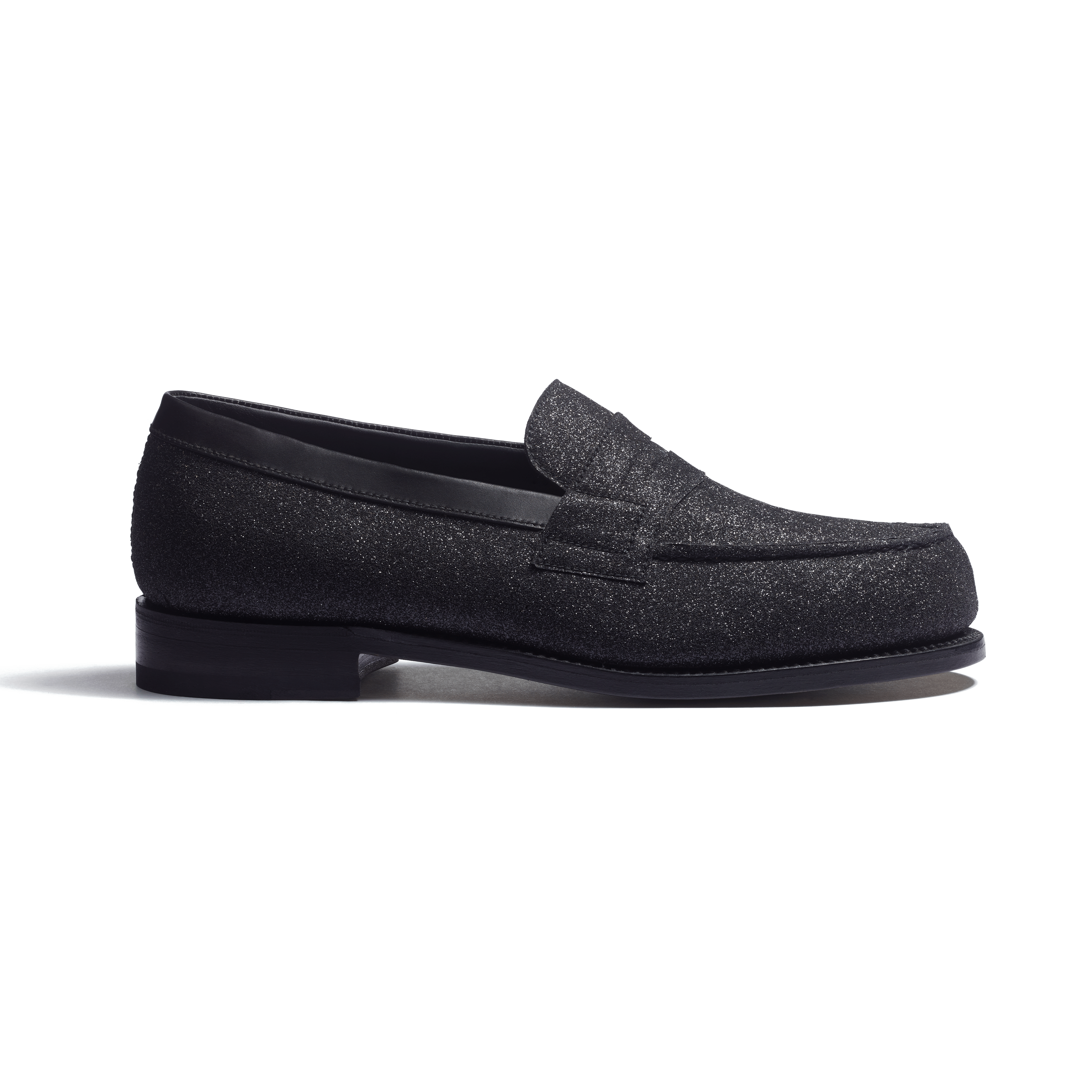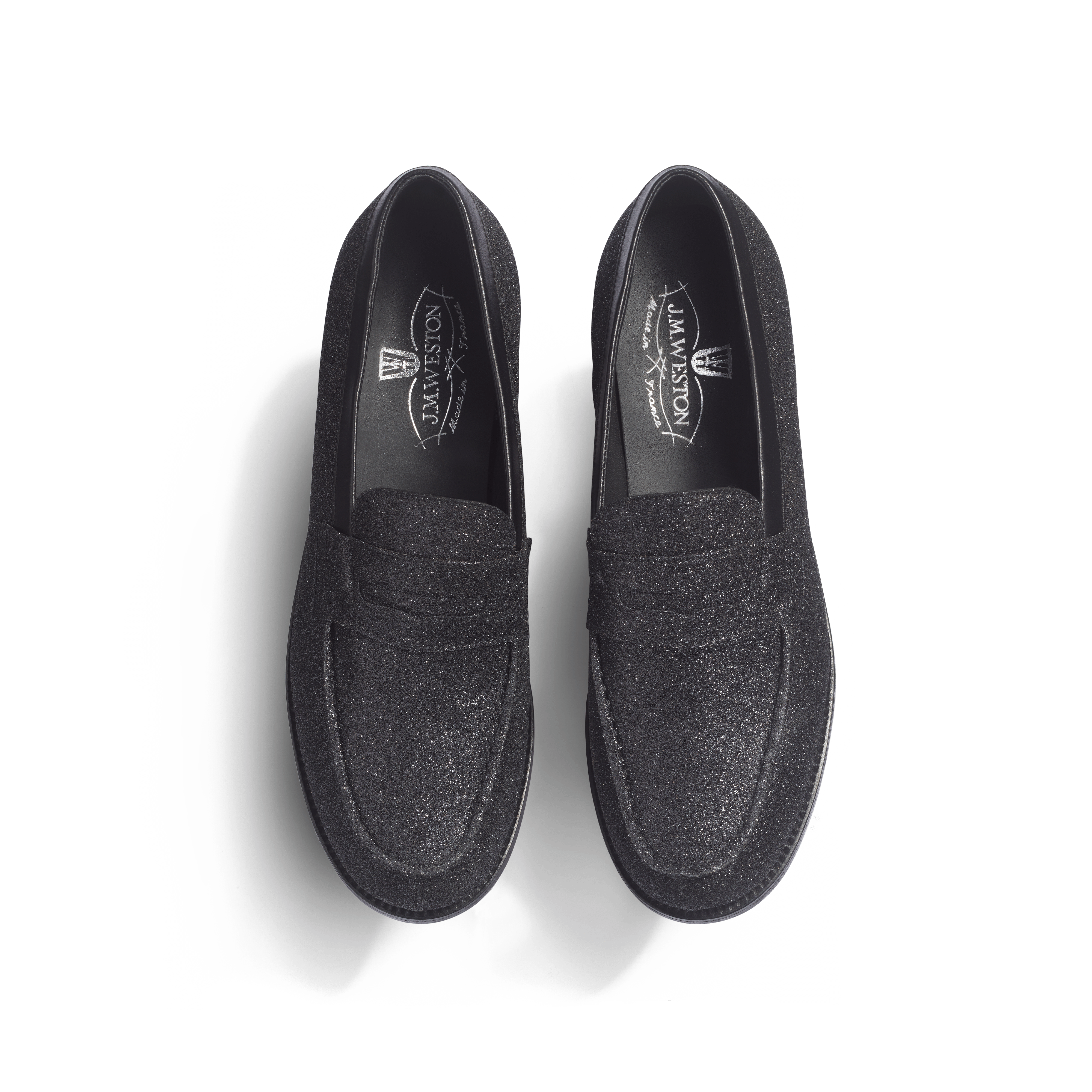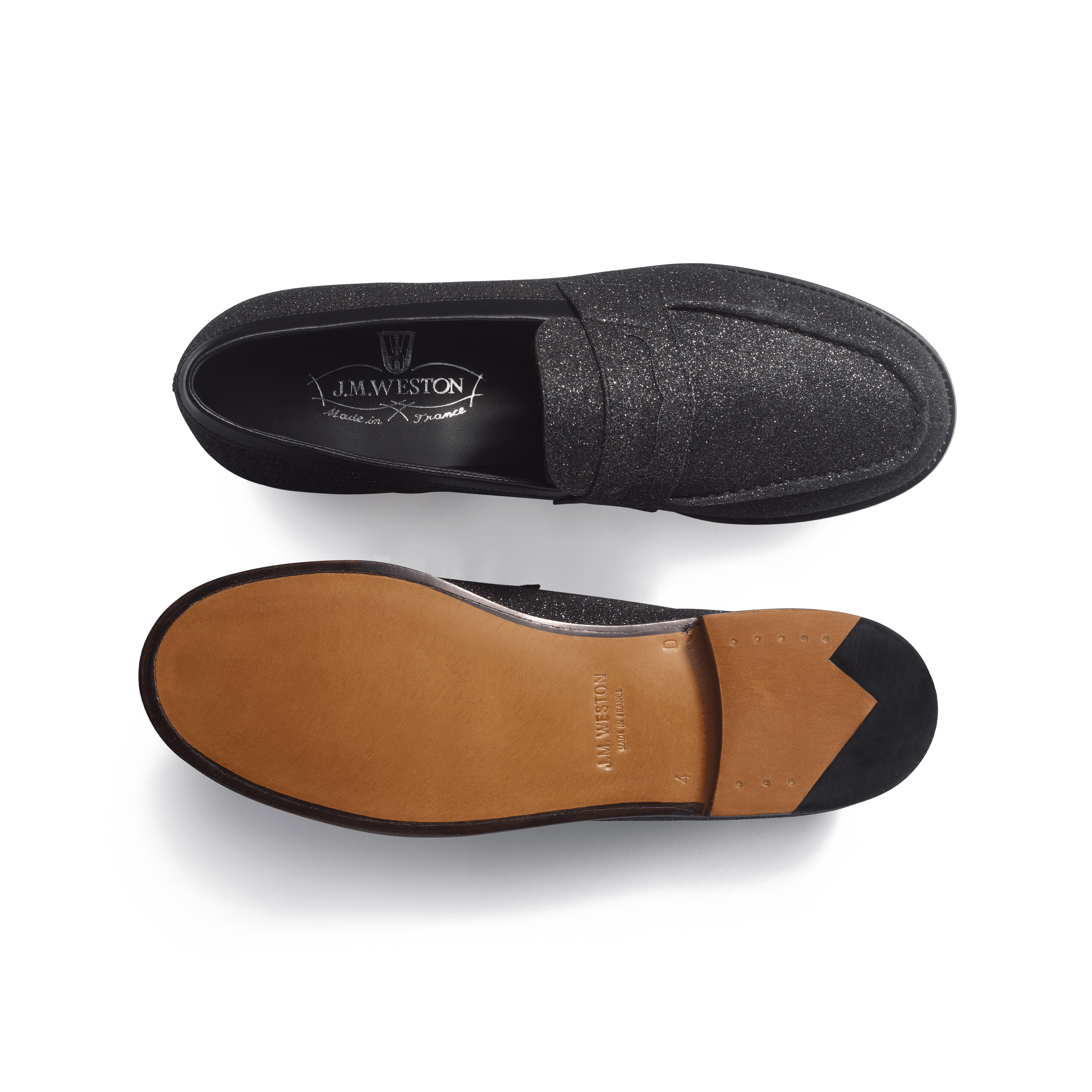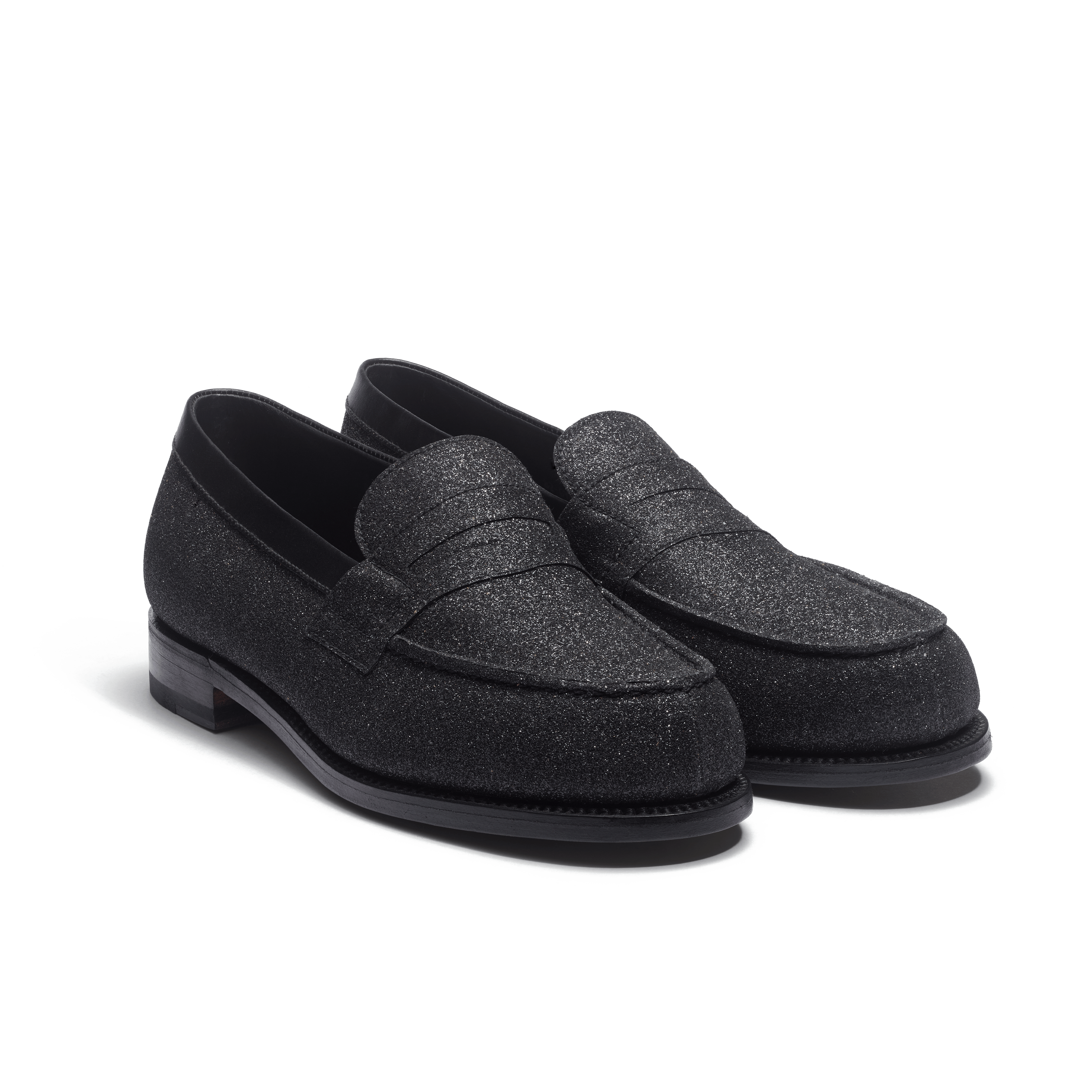 - ブラックのグリッター加工を施したゴートスキンのアッパー- ブラックカラーのカーフスキンライニング- グッドイヤー製法- フランスのタンナー〈Bastin & Fils〉によるベジタブルタンニンなめしのソール- フランス・リモージュ製