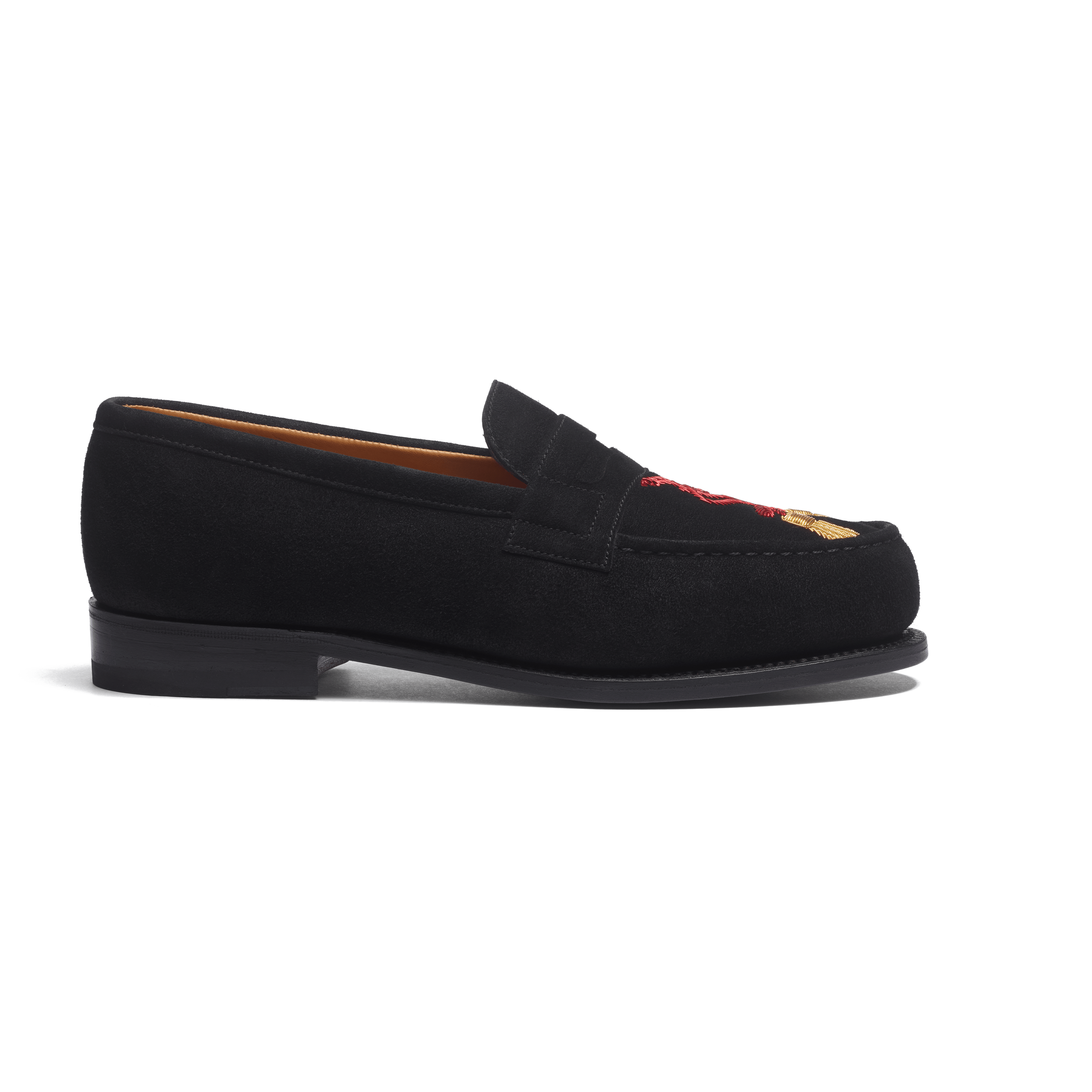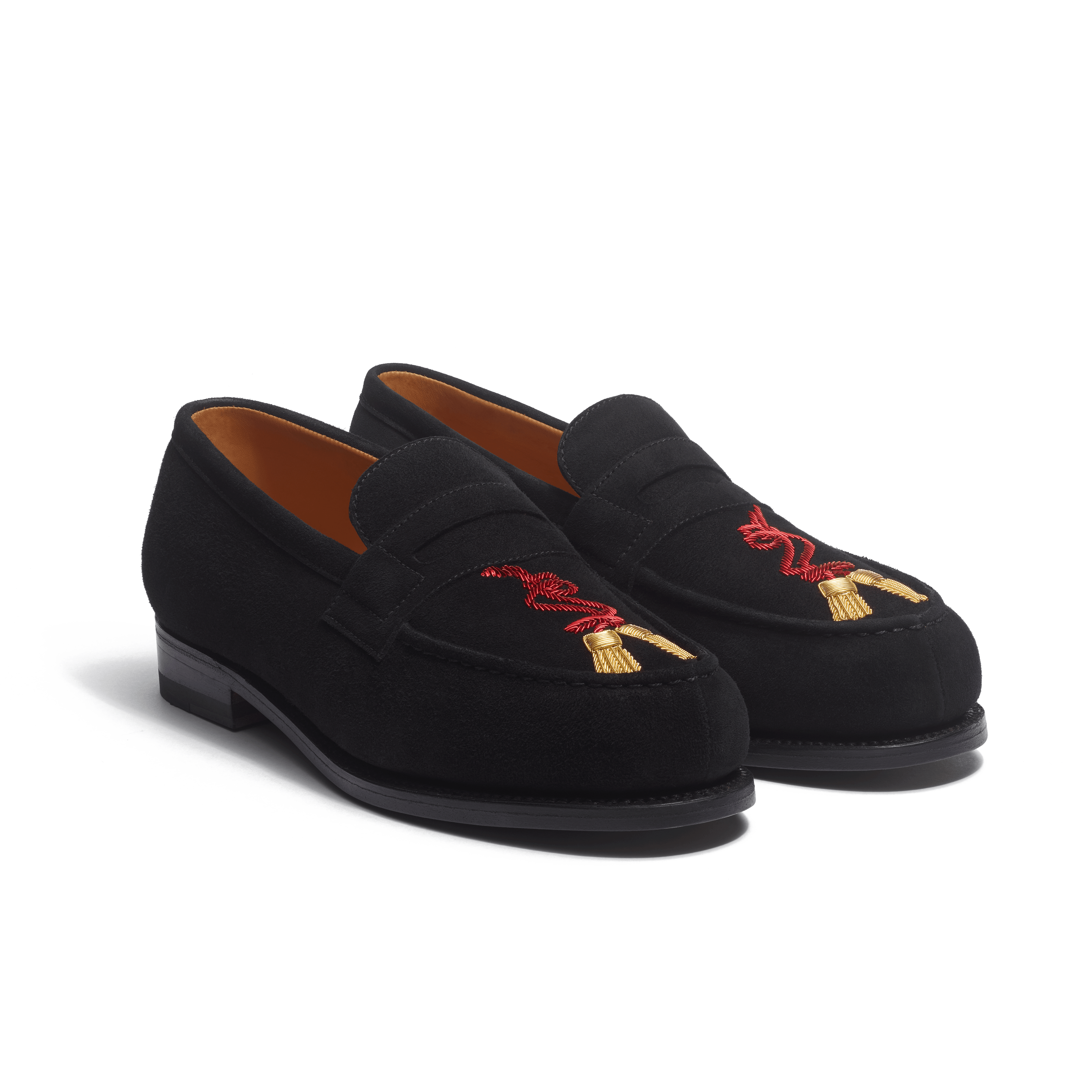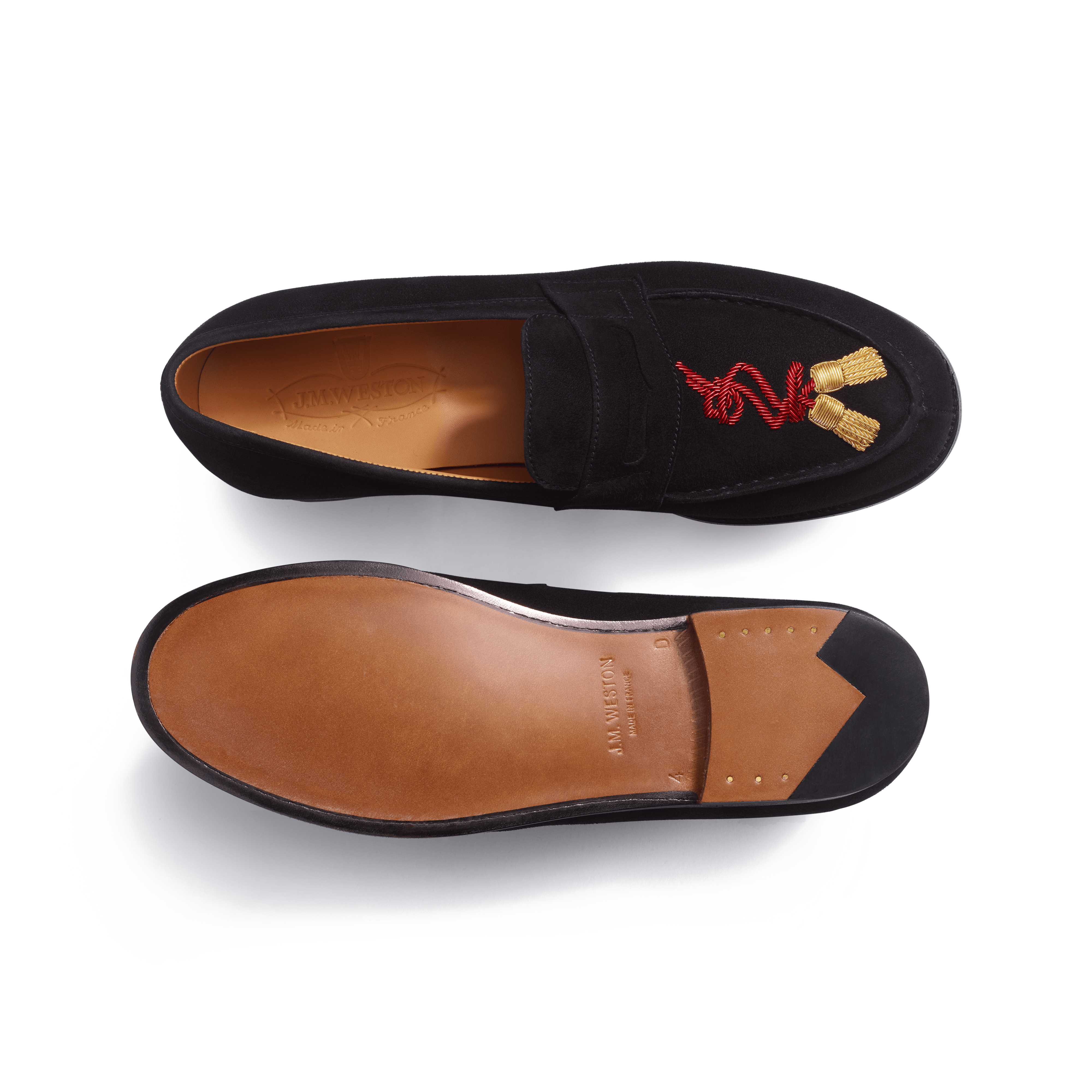 - ブラックゴートスエードのアッパー- レッド&イエローのオートクチュールで用いられる伝統技法であるブリオン刺繍- ナチュラルカラーのカーフスキンライニング- グッドイヤー製法-フランスのタンナー〈Bastin & Fils〉によるベジタブルタンニンなめしのソール- フランス・リモージュ製