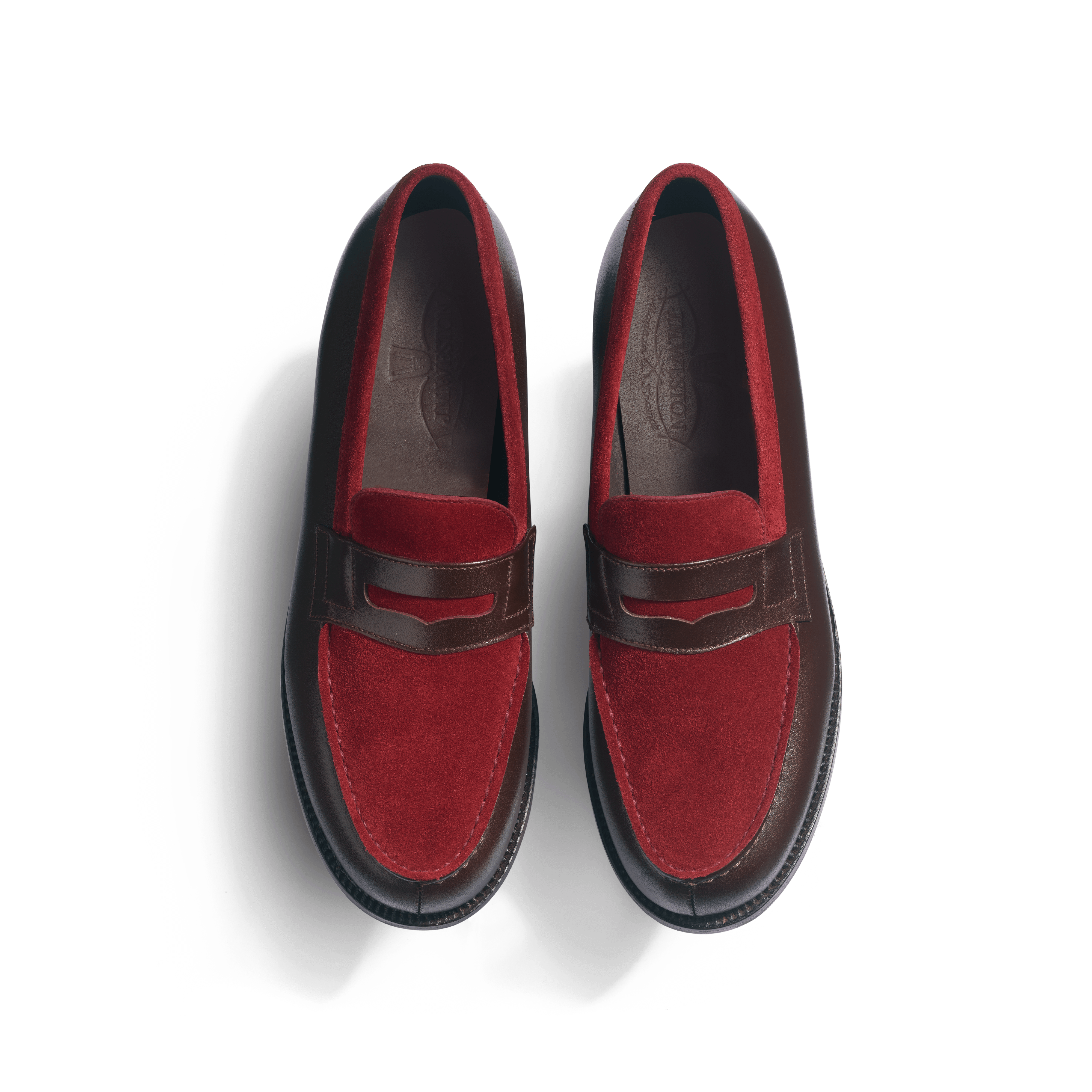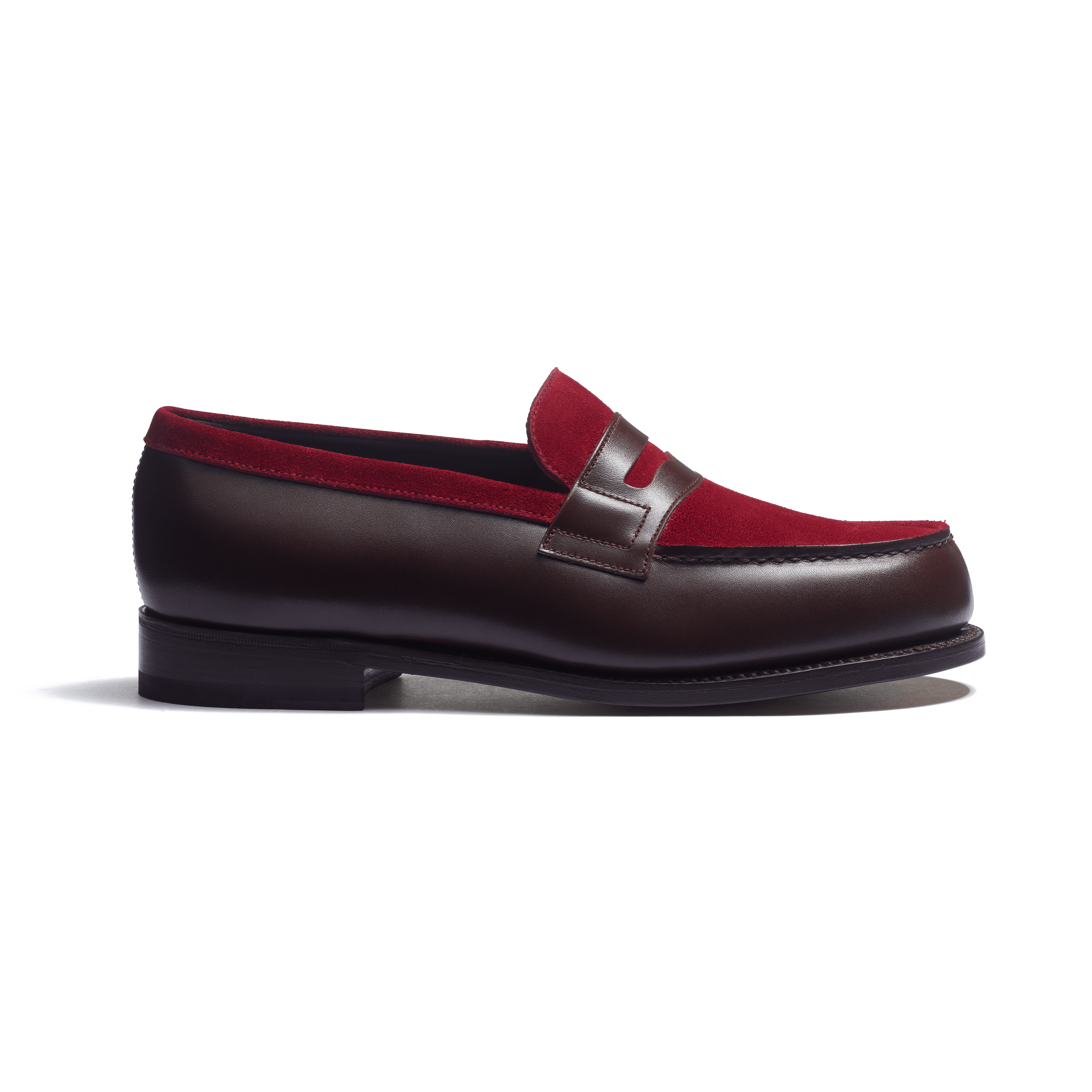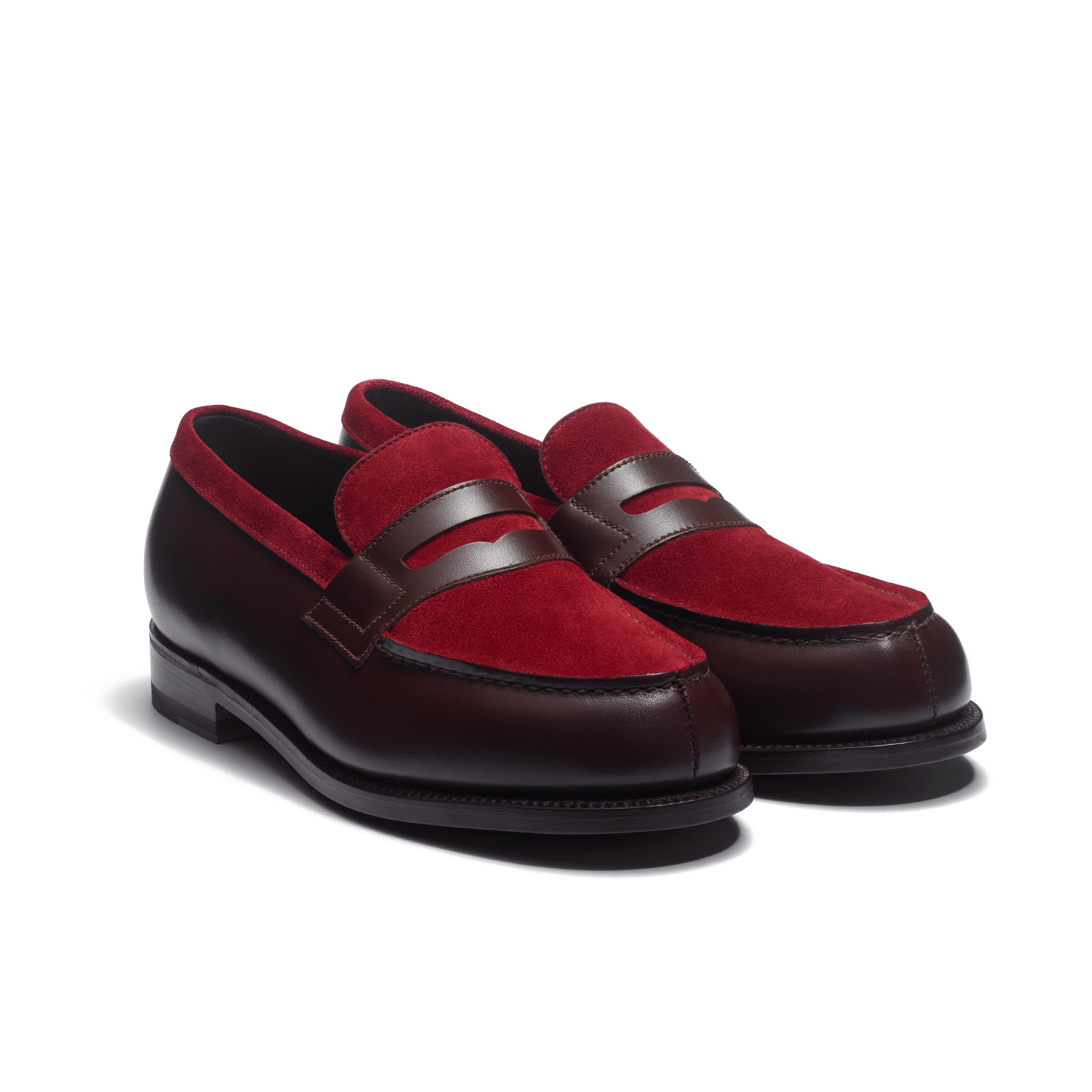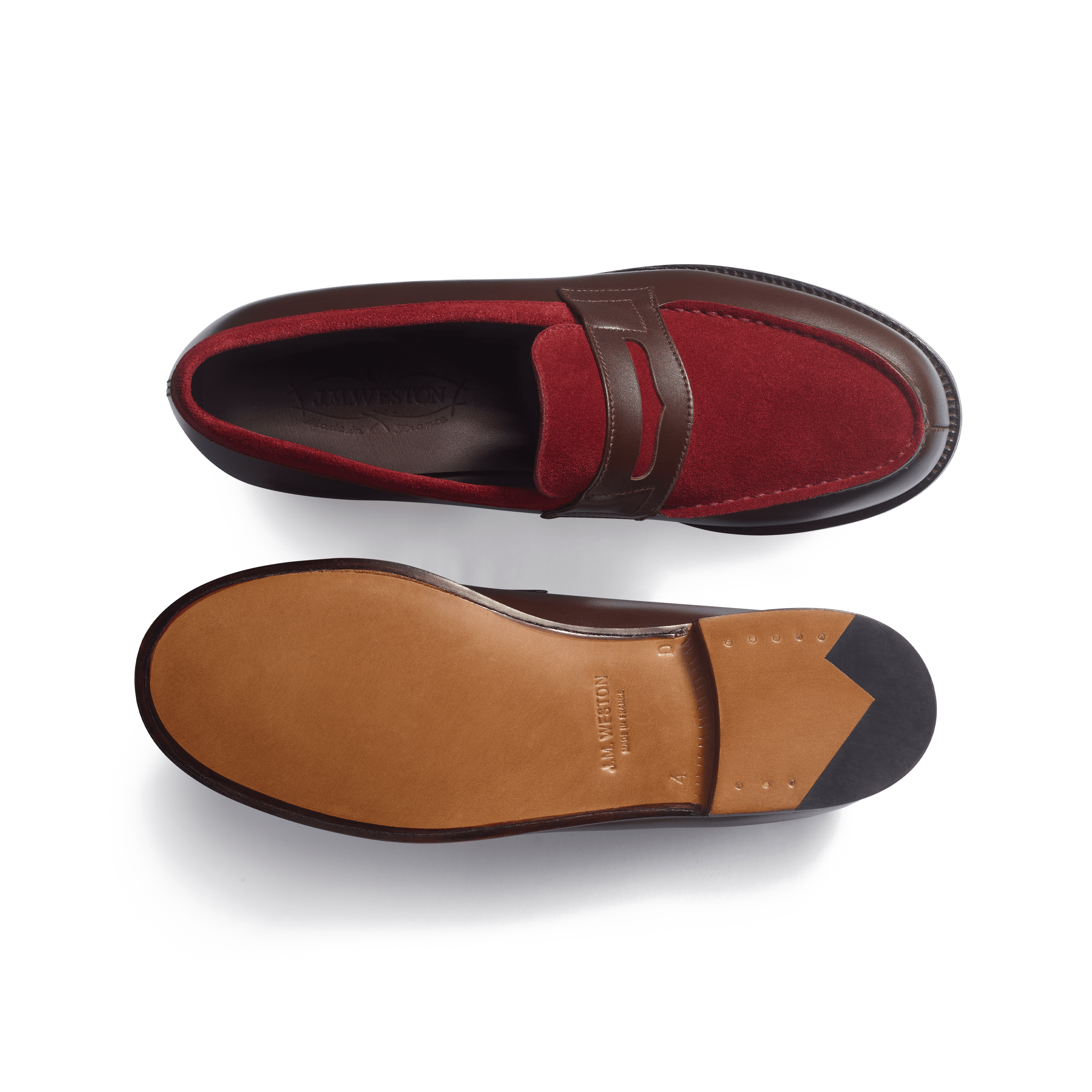 - ダークブラウンボックスカーフ、バーガンディスエードのコンビ- ダークブラウンカラーのカーフスキンライニング- グッドイヤー製法- フランスのタンナー〈Bastin & Fils〉によるベジタブルタンニンなめしのソール- フランス・リモージュ製